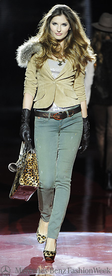 Leather is a big hit for the fall/winter season and there were great looks that hit the catwalk in this collection. Skin tight leather pants and shorts were worn with low-slung belts. A black leather full short skirt with wide waistband and long sleeved jean shirt could easily transition for a day on the town or an evening of dancing.