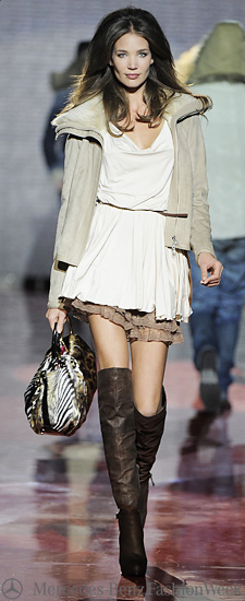 The classic ‘Guess’ jean dress was shown on the runway. For a sort of different look, a striped white and blue criss-cross sweater was thrown over the dress and the outfit was accessorized with gold opaque hose and white short leg warmers.