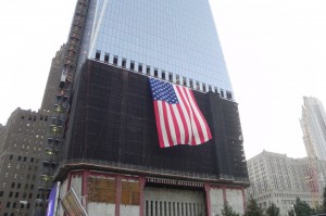 The sun was barely rising in the sky when we arrived but it was a patriotic feeling to gaze over at the new skyscraper escalating towards the clouds on the spot of Ground Zero and see the large American flag draping a portion of the building with a sense of strength and fortitude.