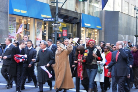 East 44th Street was the scene where the honorable Mayor Michael Bloomberg gave his tribute to the Vets and he was surrounded by security personnel as well as an ecstatic crowd.