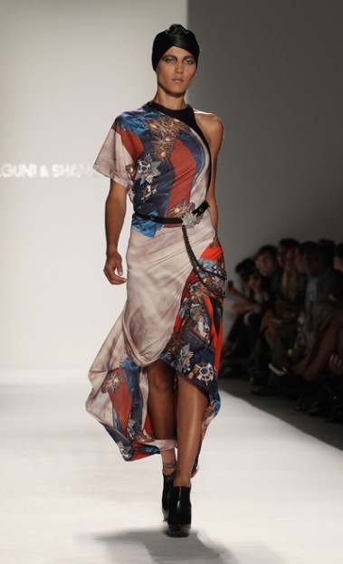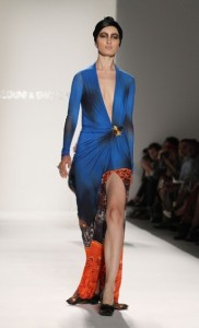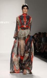 Spirited designs and rich imprinted artistic pictures adorned the pieces. The free flowing fabrics importantly characteristic for Spring 2012 were seen on the runway along with form-fitting dresses in many silhouettes to accentuate the perfect figure. It was a theatrical bonanza of beautiful fashions. Deep red or bold black turbans were dramatic headpieces to accessorize the outfits.