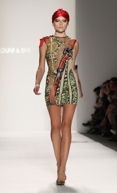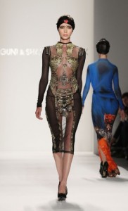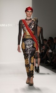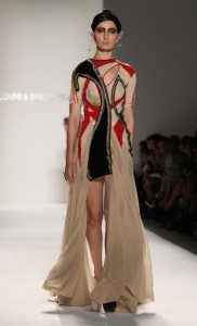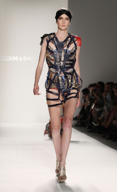 Intricacy is very important to the design team and could be easily seen in their feather detail, embellishment and sequins. Powerful colors such as ominous orange, gallant red, glittering gold, steaming scarlet, beaming black and yellow were part of the palette. Chiffon, tulle, velvet, satin and lycra were fabrics of choice. Leather harnesses and chain detail along with eagle motifs were used in unusual ways to complete some of the transcendent outfits.