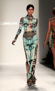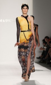 The runway was transformed from low cut jersey gowns fastened at the waist with a brooch and a slit up the leg to short spider-webbing outfits suggestive of a wild dream. A short sparkling black and yellow dress was finished with a feather hemline. The madness continued with cutout bodycon dresses.