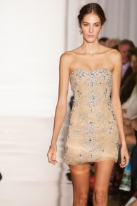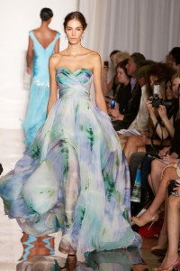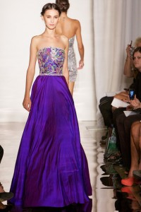 Strapless and silk made for the perfect combination. It was amazing how white and silver were given such character. As beautiful a neutral colors were, bright purples and pastel baby blues and deep greens and fiery reds brought the runway to life in dramatic beaded bodices with much in the way of ruffles and embellishment. It’s important to note that lengths varied from form-fitting short dresses to the long elegant gown.