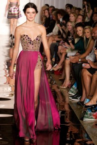 The ballerina tulle skirt gave a sense of innocence and femininity. Another astonishing dress was the strapless mini which fit the model just like a glass mirror that shot magical rays of light across the runway. Kendall Jenner wore a number of exquisite outfits from a gold and purple sequined top and short covered with a satiny purple long gown with an extensive slit up the leg to a ballerina embellished tutu dress covered with feathers on the skirt.