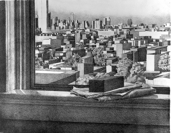 - Catherine Murphy – Catherine makes the most of our surroundings that we may not even notice but yet have a profound effect on us. She recreates images from her memory and dreams, rather than photographs. Murphy has also been awarded with National Endowment for the Arts Grants (1979 and 1989), a Guggenheim Fellowship (1982), and membership to the American Academy and Institute of Arts and Letters (2002). She was a Senior Critic at Yale University Graduate School of Art for 22 years and currently holds the Tepper Family Endowed Chair in Visual Arts at the Mason Gross School of the Arts at Rutgers.  Her works are on display in the Whitney Museum of American Art, the MoMA, and the Art Institute of Chicago. Ms. Murphy is the distinguished recipient of the 2014 Robert De Niro, Sr. Prize for her achievements in painting.  This particular work of art is called Still Life with View of Hoboken and Manhattan.