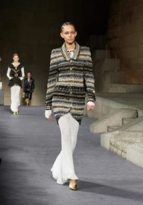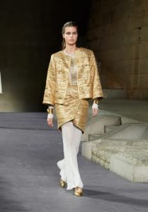 Of course, no Chanel show would be complete without the iconic tweed suit representative of the luxury brand, seen in various versions, many adorned with gold trim. Long skirts, side slit skirts and even pants were a match for any stylish woman. One of the head turners of the collection proved to be a pair of shiny red pants paired with an oversized sweater, perfect for the winter chill.