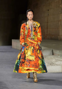 In the background, the foreboding archaic Egyptian Temple of Dendur was overpowering as models appeared from behind the huge structure to take their walk only to retreat and have the Temple swallow them back up. The Egyptian influence could clearly be seen in the graphic prints and lotus flower patterns on most of the pieces. Heels were encrusted with pearls, golden knee high boots glistened from afar and gold leather hats were the likes of a modern-day turban. Seeing such intricate embroidery on the jackets was simply worship-worthy. Fitted sweater dresses over neutral white pants and lush croc leather long jackets and bomber jackets were divine. From distressed denim seen on favorite fashion model, Kaia Gerber, to feminine chiffon gowns and splashes of color on go-to clothing, this show had something for every occasion. Brilliantly colored pyramid purses and gold opaque tights accessorized well, keeping in line with the theme.