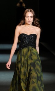 Feathers and sequins were heavy hitters for the evening wear. Models walked the runway like goddesses in draped dresses with v necks and low slung necklines. Khaki green, rose pink and a combination of black and green rounded out the color scheme.