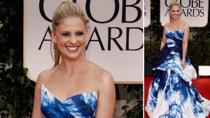 Sarah Michelle Gellar took to the Golden Globe Red Carpet in a strapless blue and white full skirted gown by Monique Lhuillier which was a perfect fit for the occasion.
