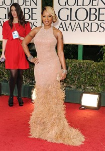 Mary J. Blige was dazzling in a Kors original halter top glittering, form-fitting gown, finished off with feathers at the bottom.