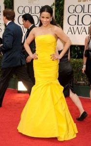 The yellow strapless Monique Lhuillier mermaid gown with ruffled bottom was extremely complimentary to Paula Patton as her dress of choice at The Golden Globe Awards.
