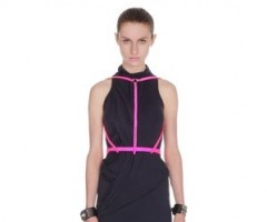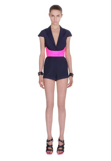 Creative shapes were also part of the whole look. A strapless black scuba dress was featured with pink detailing and pointed pockets. A v-neck navy playsuit had capped shoulders and a bright pink corset belt. There was fluro piping and plenty of zippers in the collection.