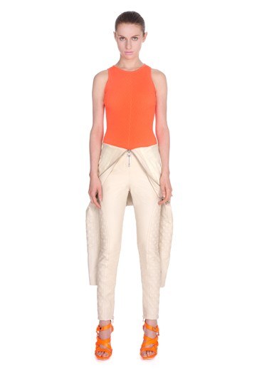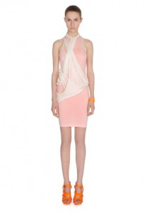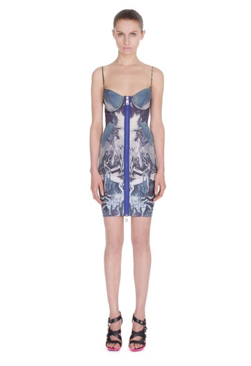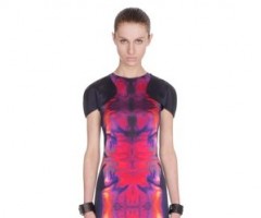 McQ Resort Collection 2012 is the newest diffusion line by the house of British couturier designer, Alexander McQueen. Inspired by the sleek wetsuit worn by scuba divers, the clothes fit tight to the body in strikingly bright colors. Hugging the runway were tank dresses, shift dresses, white and blue leggings with loads of zippers, tank tops and tie-dye wetsuit tees.