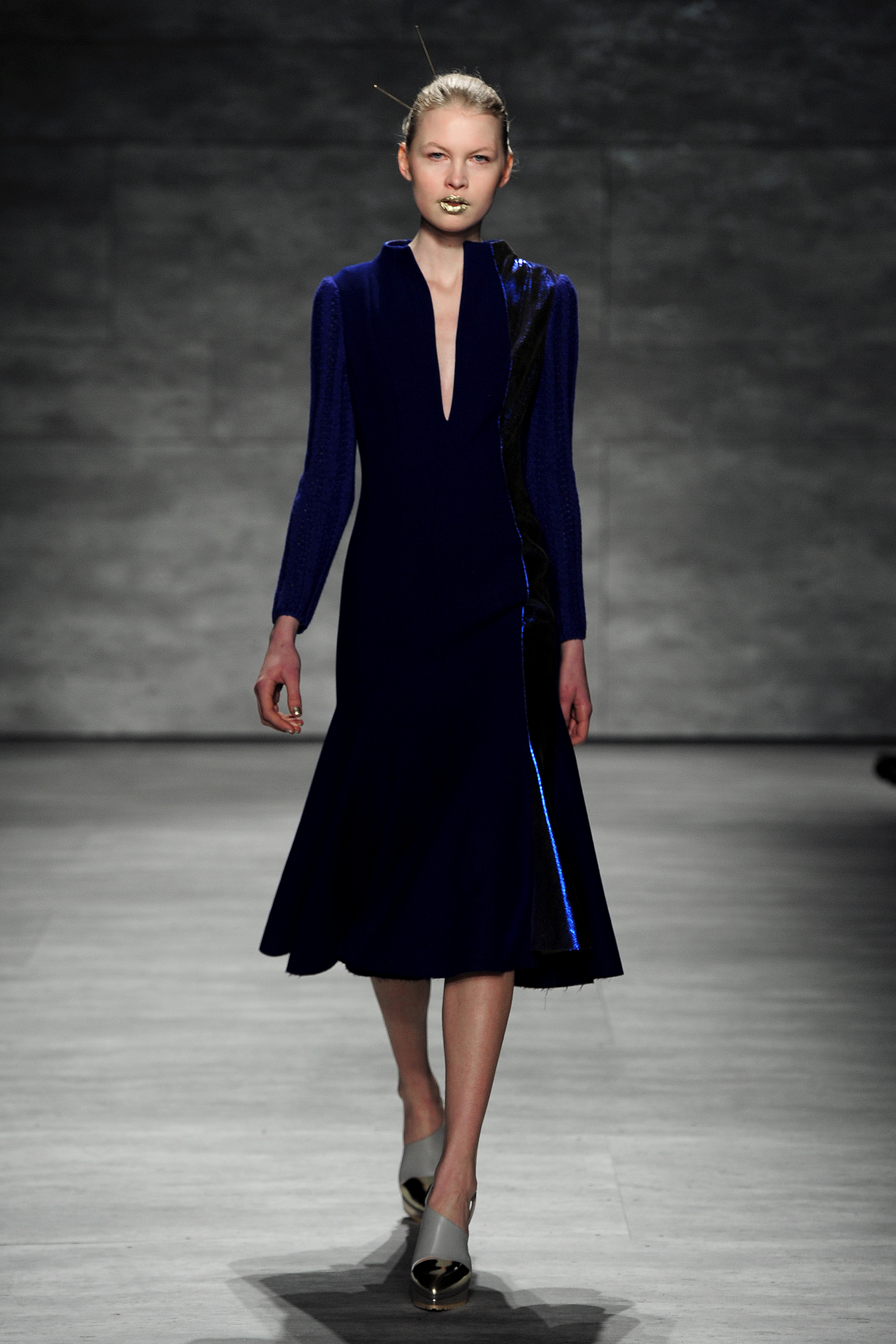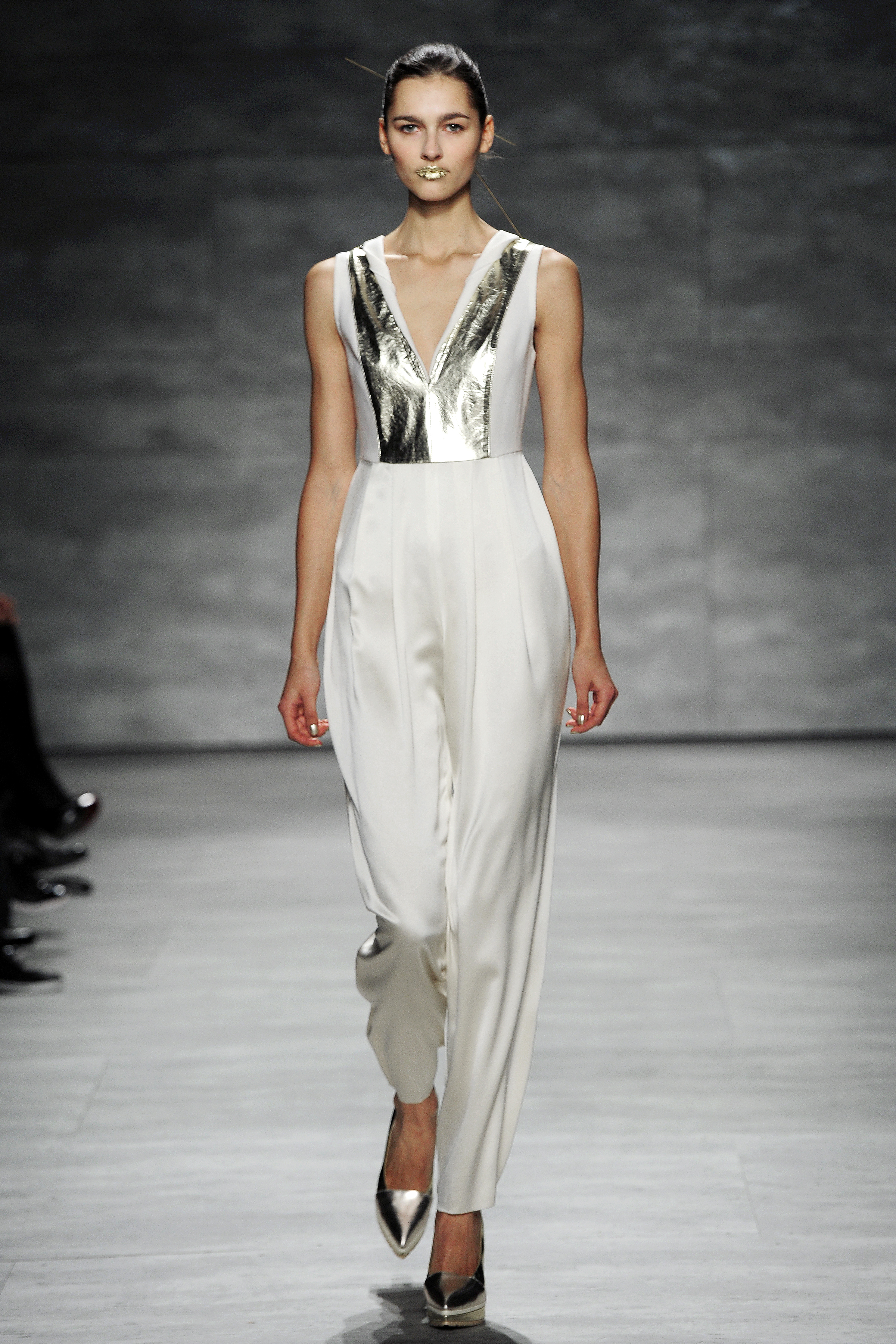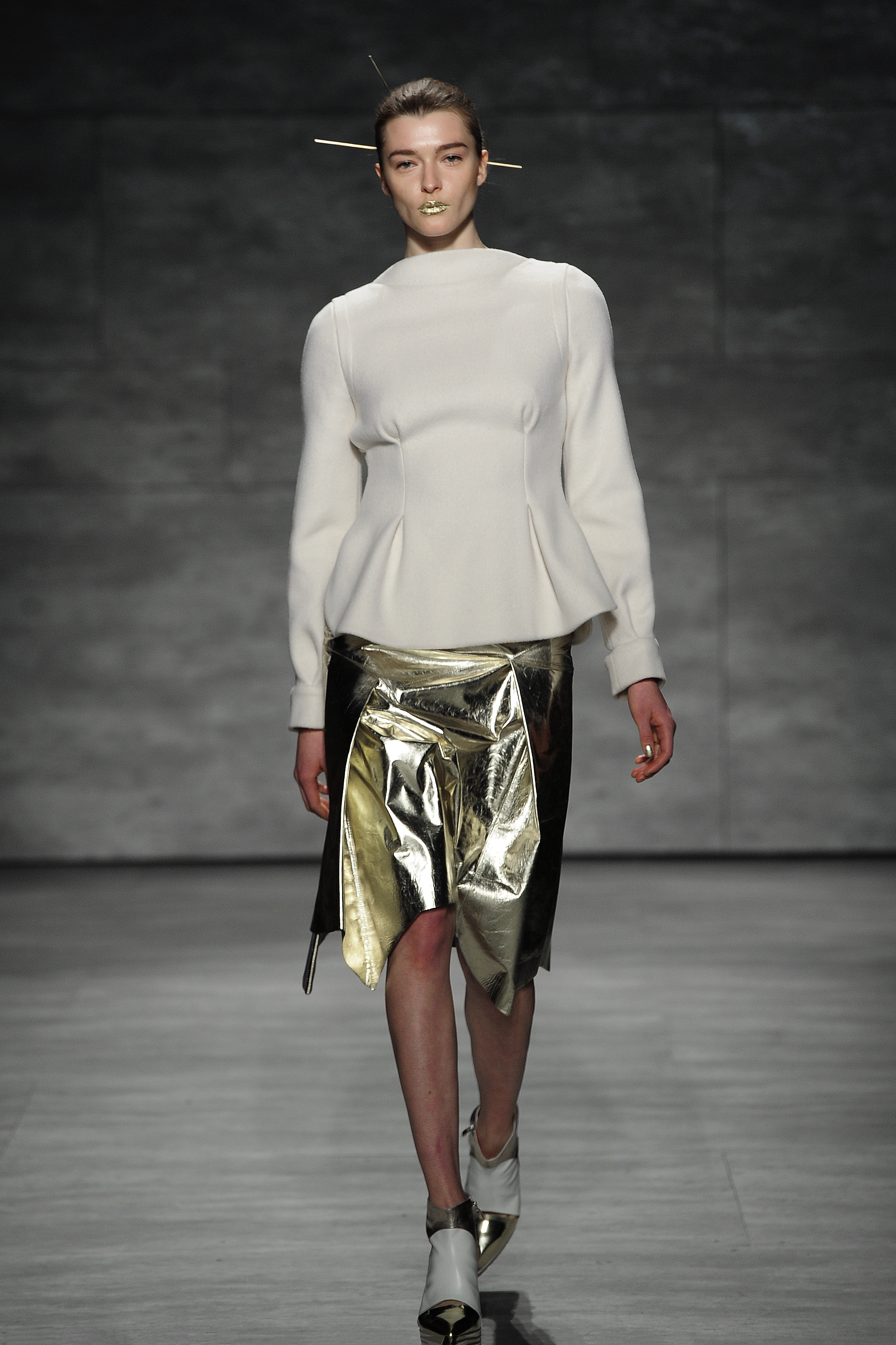 The inspiration for the designer this season was the abstract expressionist, Mark Rothko, who always seemed to convey poignant sentiments from joy to sadness using color to get that feeling across to his enthusiasts. Son Jung Wan carried that emotion into the creation of all of her pieces shown on the runway. Gold was one of the most dominant colors of the collection including the color of the lipstick worn by the models. They bore a strong resemblance to Greek goddesses with the gold lips and fair complexions and stone-like eyes.