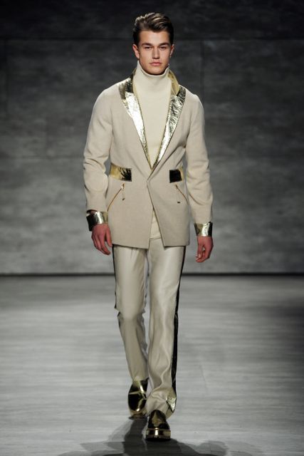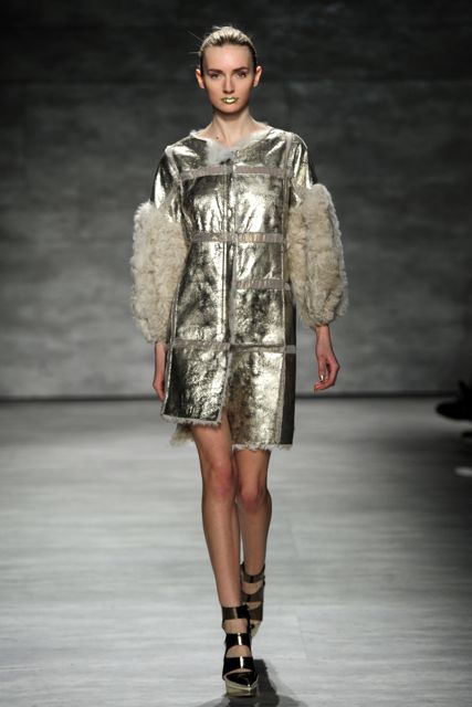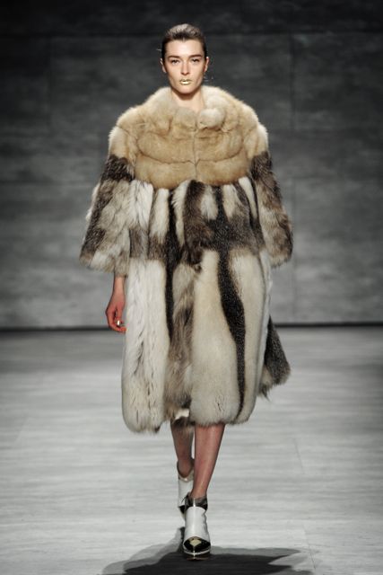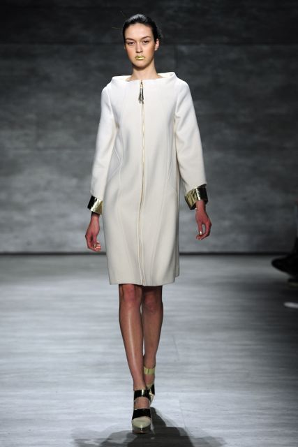 To Wan, dressing the man is just as important as dressing the woman and the show was a mixture of that magic. Men wore white coats trimmed with a gold metallic collar and dark clothing was demure. Rounded collars and futuristic sideways zippers added a sense of originality. Fur sleeves, varying lengths of dresses and oversized fur coats were all well noticed.
