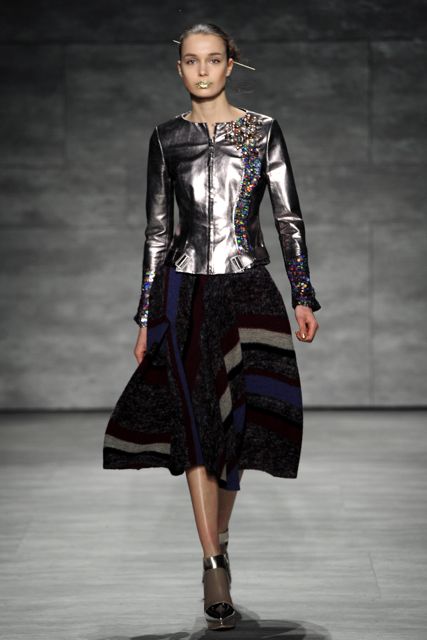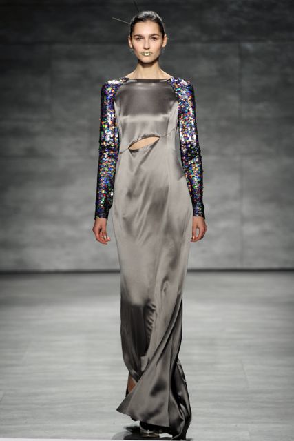 Clothing in hazelnut and ivory hues was punctuated with jewel tones in sapphires, plums and garnet. Pieces that were imprinted in our minds included cream cashmere sculptural jackets, gold leather leggings, fur coats in vibrant colors and chic gunmetal/multi-sequin cocktail dresses for an evening of stand-out fashion.