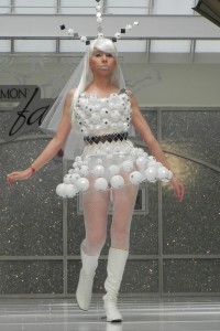 The final ten outfits made use of film, vinyl, flowers, feathers, mirrored balls, electrical wire and motorized elements.