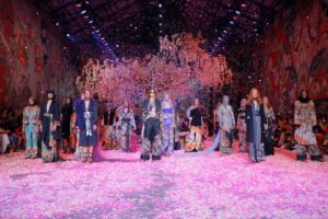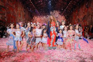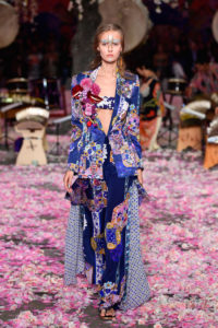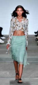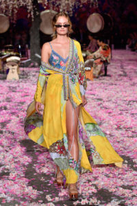 Other designers included Lee Mathews with looks that could steal your heart on a beautiful summer day. Double Rainbouu paired stripes with patterns, sleepwear with daywear. One of my very favorite collections came from We Are Kindred. The presentation favored flowers throughout the entire show and even baskets were laid out on along the runway. Most of the looks were accessorized with either large, floppy hats or silken scarves and a long hanging golden or diamond earring. The dresses were short, ankle length, floor length and were of soft silky, shear fabric. Every model was a princess adorned with their own magical personality to suit their outfit. Complexions were glowing.