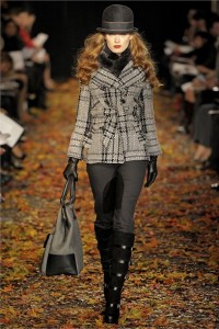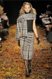 The models were cultured and refined in textured plaids. Leather was an added touch to a charcoal draped jersey dress and a black and white tweed jacket with leather sleeves over black leather jodhpur.