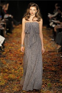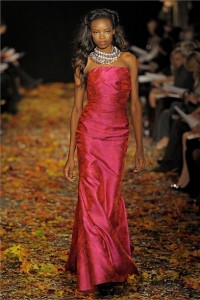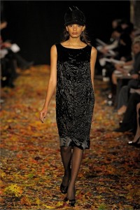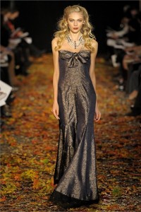 Evening Wear is so aristocratic as we watched the models glide down the fall-colored pathway in a silver moire flared strapless cocktail dress, a fuchsia shantung gown with black lace back, a black panne’ velvet mermaid gown with beaded decollete’ and the finale of the show and certainly a classic prize-winning gown of black/white and silver beaded taffeta.
