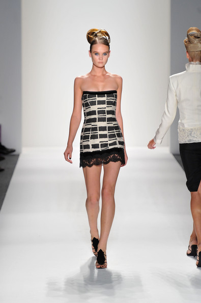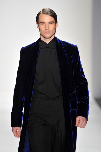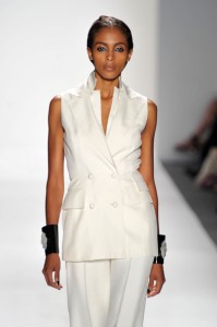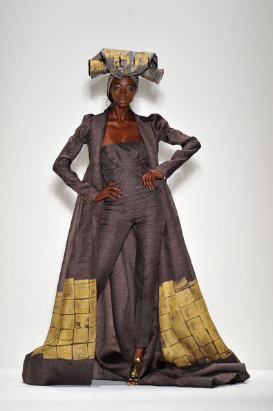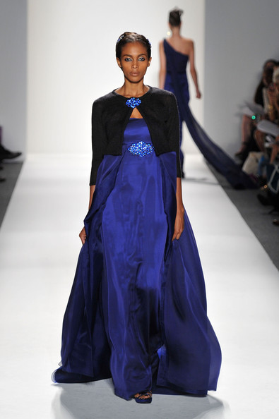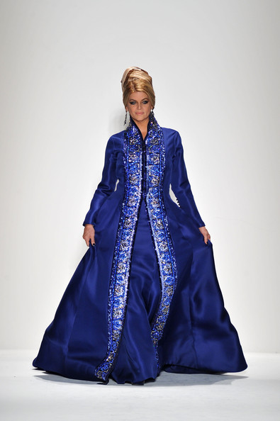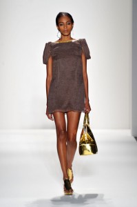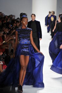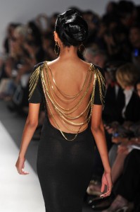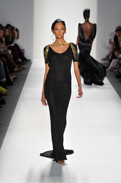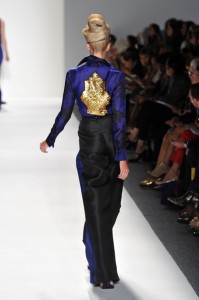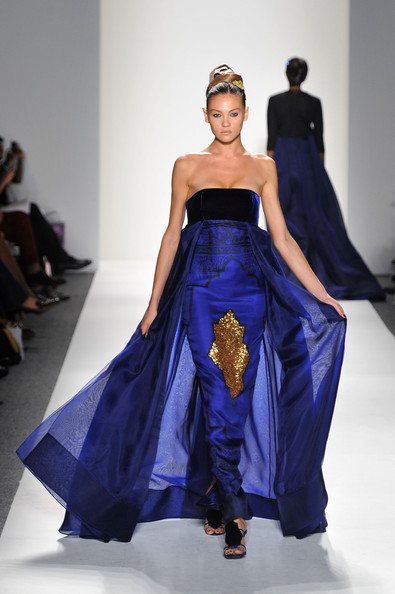 At his Spring 2012 Fashion Show from Mercedes-Benz Spring 2012 Fashion Week, the show began with the soft sounds of a harpist in dimmed lighting as the anticipation began to build. The first outfit was tantalizing. A model sauntered out in a desert silk gazar linen Goddess coat bordered with a 23 carat gold leaf and matching strapless jumpsuit and headdress.