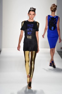 Zang Toi had a theme for this show, “My Dream of North America” and he expressed himself with an ebony silk jersey t-shirt with sapphire and gold beading ‘Make Love Not War’. This was worn over tight metallic gold futuristic leggings.