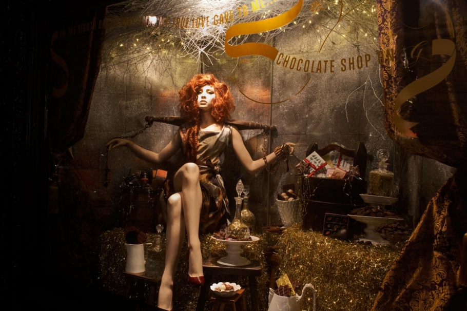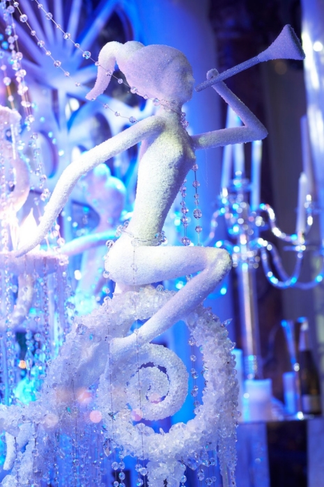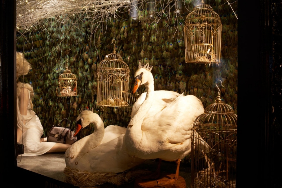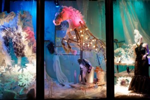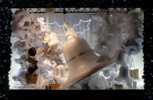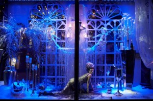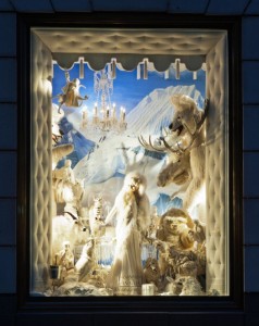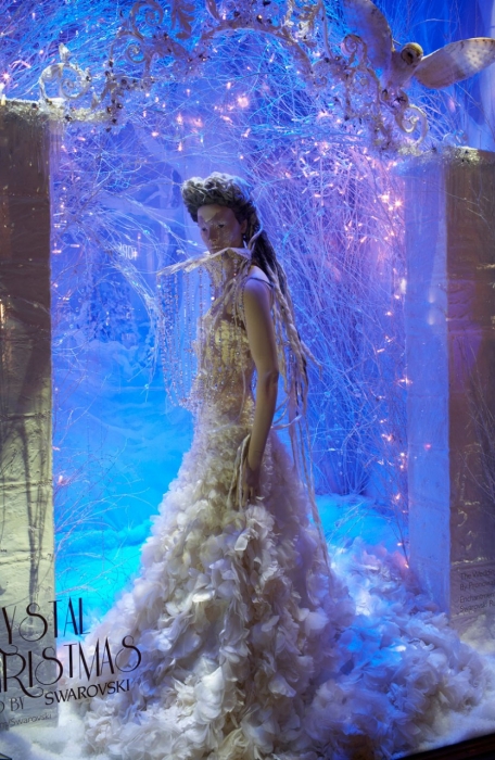 London competes with a whimsical window theme at Harrod’s. “A Crystal Christmas” captivates with sparkles on winter complete with ice branches and chandelier-like crystal swags and champagne and candles topped with an angel of the evening. Fashion is intertwined with a cascading snowflake evening gown.