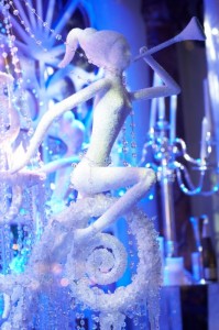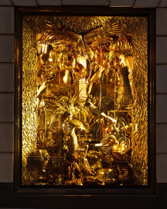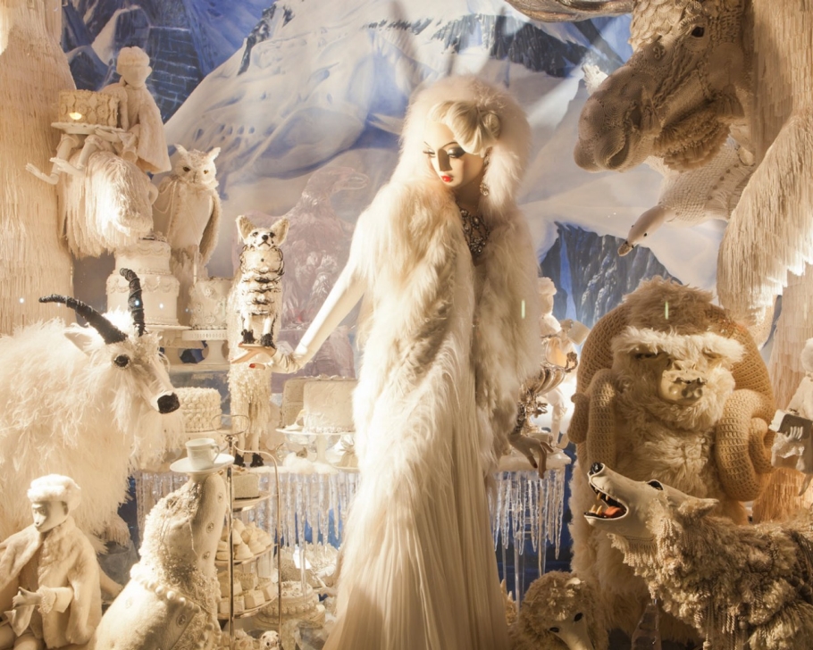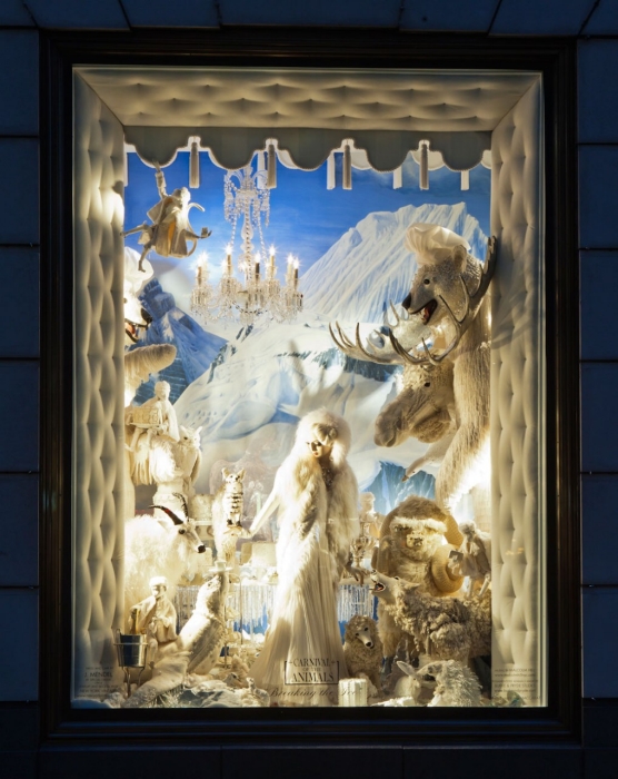 Bergdorf Goodman mystifies audiences with “The Carnival of the Animals”. A white ice princess is surrounded by beading, fringe, tassels, snow and winter white animals. Crocheted horns on a ram and a seal balancing a teacup tantalize crowds. The “Brass Menagerie” glistens in the evening light.