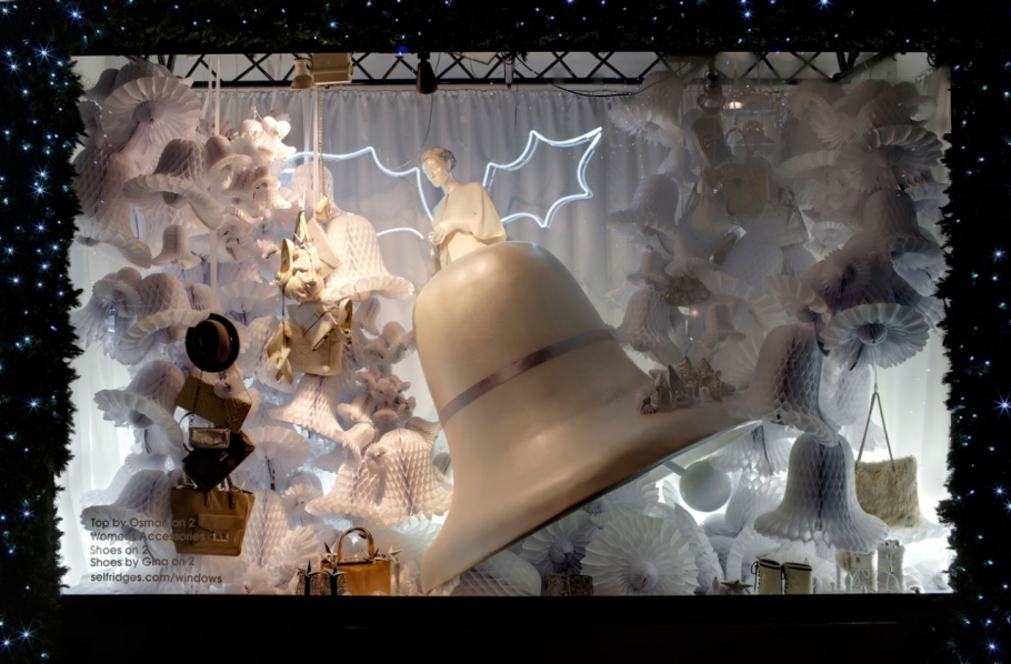 Selfridges of London took window winter to the extreme. An oversized angel with luminescent wings amidst bells of silver puts you in the mood magnificently. L.E.D. angels light up daring dreams of futuristic promises.