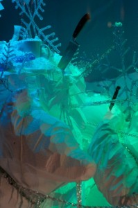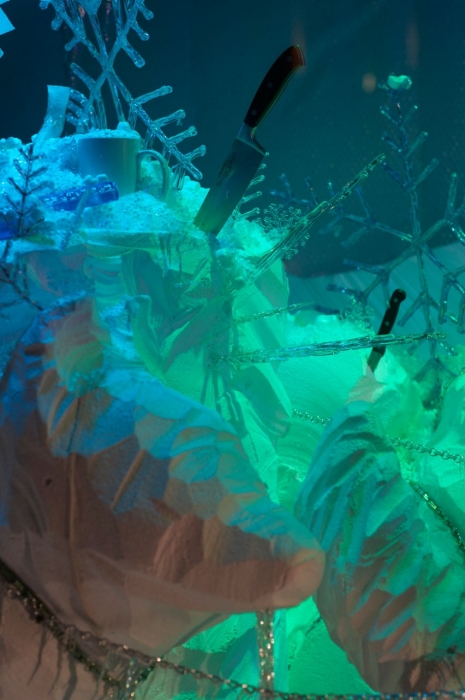 “Frozen Christmas” is frigid yet fine in the window of Harvey Nichols. Fashion rears its fancy head as a whale’s tail submerges and polar bears signify cold. Knives are suspended in frozen snow drifts.