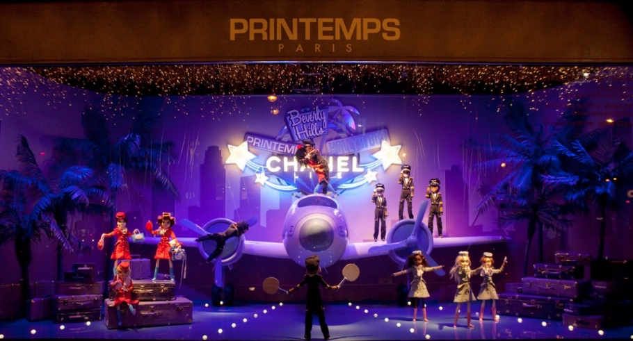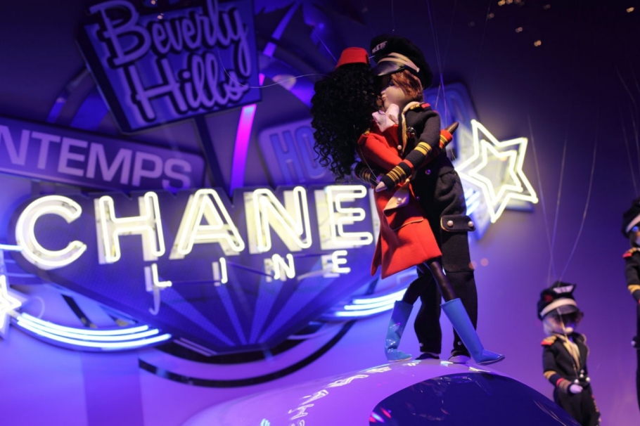 Chanel and Karl Lagerfeld dream large in the Paris window on Printemps. Hollywood is here with pilots, flight attendants and pretty palms on a midwinter’s night dream. Romance takes flight. A multitude of tiny Karl Lagerfeld dolls sing from the rooftops, the towers and even the Eiffel Tower.