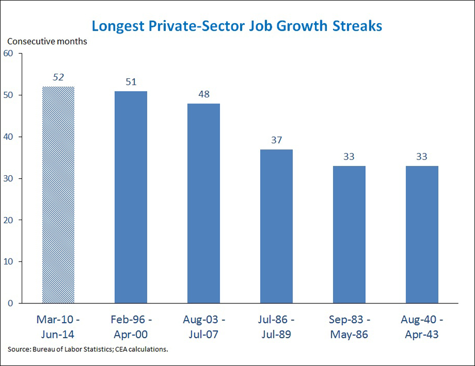2. Private employment has increased in 52 consecutive months, the longest streak on record. The current 52-month streak has now surpassed the previous record of 51 consecutive months from February 1996 to April 2000, making it the longest streak in data going back to 1939. The steadiness of job gains is a sign of the progress that has been made in the recovery, but the President continues to believe that more can and should be done to further build on this progress.