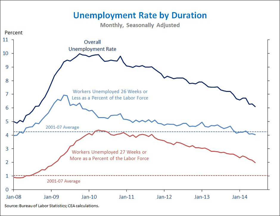 3. The unemployment rate has fallen 1.4 percentage points over the past year, the sharpest year-over-year decline in nearly three decades. The unemployment rate remains elevated because of an unacceptably high prevalence of long-term unemployment, but it is encouraging that roughly half the decline in the overall unemployment rate over the past year has come from a falling long-term unemployment rate, a disproportionate contribution since the long-term unemployed represent about one-third of the total unemployed. Another positive sign is that the overall unemployment rate has fallen 1.1 percentage point since last October entirely due to people getting jobs, as the labor force participation rate has been unchanged on balance over this time.