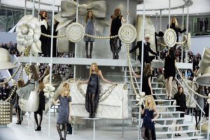 Who could forget the imaginative and richly colored carousel with large Chanel bags instead of horses with models hanging on to the moment? Props were not difficult for Karl Lagerfeld to think up and bring to life. In his progression of shows, he used a giant bronzed lion statue, he used Parisian streetlights darkened on purpose, a decadent buffet table complete with elaborate candelabras. We enjoyed witnessing the jagged and geometric stalagmites, an enormous globe of the world and a makeshift brasserie. Scenes for each presentation to make it seem even more realistic ranged from an ancient Greece street to a deserted beach complete with tiny waves. Imagine models walking down the aisles of a local grocery store or taking a stroll in a Mediterranean garden, a butterfly trying to keep up with the model as she saunters down the walk.
