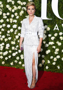 Scarlett Johansson wore a custom white chain-embroidered crepe-sablé blazer and skirt from Michael Kors Collection and a silver Elsie clutch from MICHAEL Michael Kors.