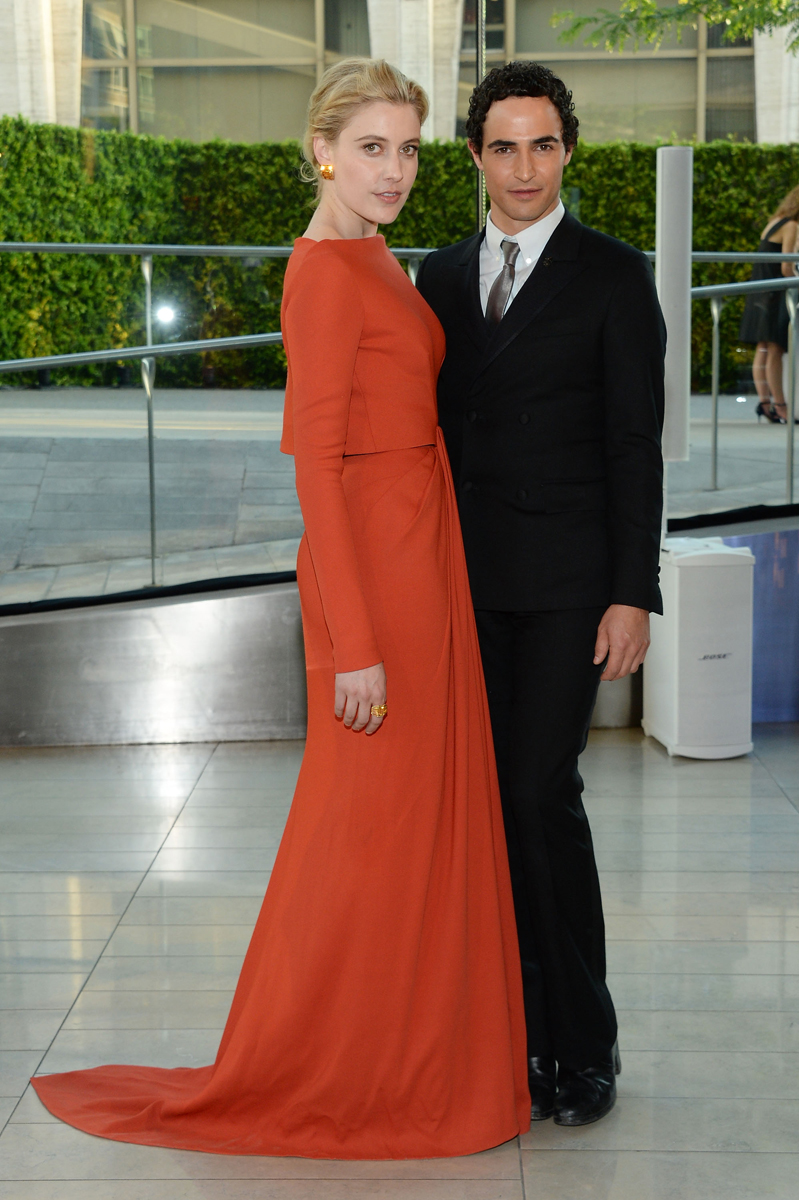 Greta Gerwig was in a vibrant red gown from Zac Posen who smiled a broad smile as he stood closely next to her proudly displaying his work.