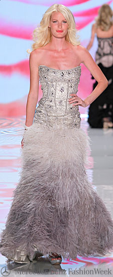 There were fabulous designers such as Basler who presented new cuts and sparkling fabrics. One shouldered floral silk dresses were paired with gold wedges and the evening took on glamour with a variety of strapless gowns embellished with lace, feathers, diamonds and sequins.