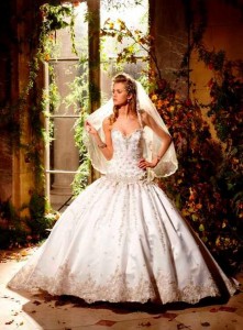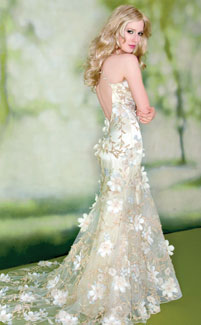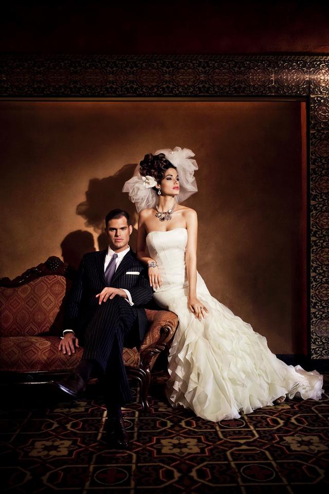 The silk and satin embellishment of Claire Pettibone Couture Bridal turns each and every bride into an elegant angel. The dramatic full hoop skirt of Eve of Milady gowns with detailed intricacy catapults us into an era of honorable queens and duchesses. Anne Barge uses sheer tulle and chantilly lace to put her brides on top of the world. My all-time favorite is Badgley Mischka, masters of their trade. The splendor of their dresses convey a magic beyond words. Ruffles, beading, diamonds and sequins put the bride on a pedestal to be admired by her groom. Winnie Couture pairs sophistication with femininity with ruched bodices, box pleating, strapless sweetheart necklines and scalloped hems.