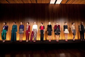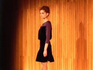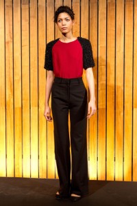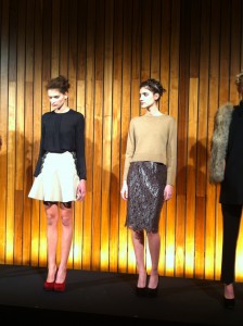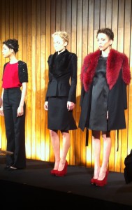 This Fall/Winter 2012 Collection was stunning, loaded with dramatic tailoring and vivid colors in blue, cranberry, purple, black and beige. A solid beige sweater was paired with a textured grayish pencil skirt. A flouncy ivory white skirt looked adorable dressed up with a black lace blouse. A black beaded cap sleeve adorned a red sweater paired with black dress pants.