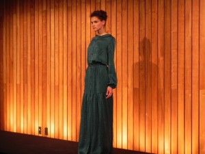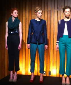 One of my favorites was the cranberry tuxedo jacket, matching skinny pant and light purple patterned blouse. Since Misha is the master of tailored jackets, we saw much in the way of these great pieces. A beaded emerald green shirt was unique, dazzling and decked with a green scarf to accommodate the winter chill.