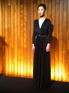 Strike that final pose as a woman of distinction heads out for the evening in a Misha Nonoo floor length black jersey gown with a low cut v-neckline and long sleeves. A skinny glittering diamond belt served as the main accessory. This is one of Misha’s favorite pieces of the collection.