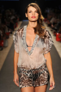 Each suit had a distinctive fit and flair. A black and white bikini was draped in a black fringe 30’s skirt which seemed to move to the beat on her hips.
