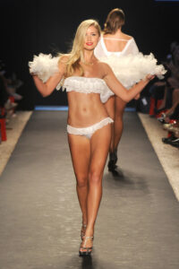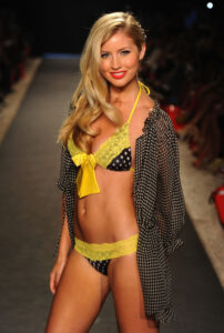 Sports Illustrated vivacious beauty, Kate Upton, made her debut down the runway in a ruffled triangle top with a crystal hip piece bottom.