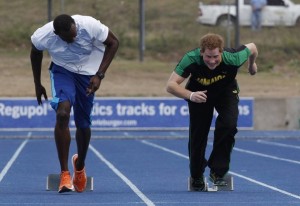 Britain’s Prince Harry (R) and Olympic gold medallist Usain Bolt start a race at the Usain Bolt track at the University of the West Indies in Kingston, Jamaica March 6, 2012. The Prince is on a week-long tour through Central America and the Caribbean acting as an ambassador for Britain’s Queen Elizabeth as part of her Diamond Jubilee.