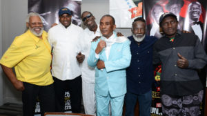 L-R: Ibo Cooper, formerly of Third World Band; Chris Roberts, CEO, Groovin In The Park; Leroy Sibbles; Ken Boothe; Freddie McGregor and Lloyd Parks at the NY launch of Groovin In The Park 2017