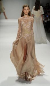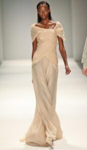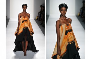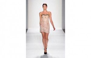 Tadashi Shoji and elegance go hand in hand. Silky fabrics in virginal white added a sense of Grecian Goddess flavor to the show. Sexy slits revealed long legs. Feminine is fashionable for this lovely collection.