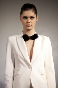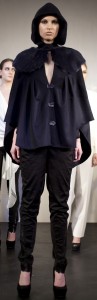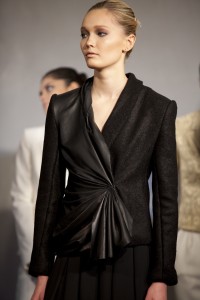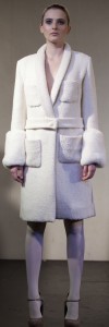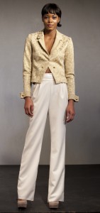 This Fall/Winter 2012 Collection was ingenious and imaginative and labeled ‘Romanza’. It was a reflection of her artistic background as a pianist with Kim’s take on tuxedo blouses and conductor jackets. Fabrics were of the highest quality of cashmere, chiffon and lamb’s leather. The designs were richly done in navy, gold, burgundy, black and white with hints of scallops and lace.