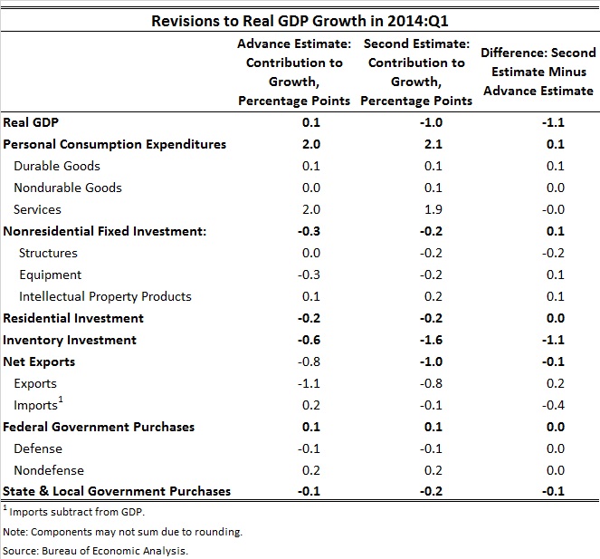 2. The downward revision to real GDP growth was almost entirely due to a downward revision to the volatile inventory investment component; revisions to the other components were small and offsetting. The contribution of inventory investment to growth was revised down a full percentage point, from -0.6 percentage point in the advance estimate to -1.6 percentage point in the latest estimate. Consumer spending and business fixed investment were revised up slightly, while net exports and State and local government spending were revised down slightly.