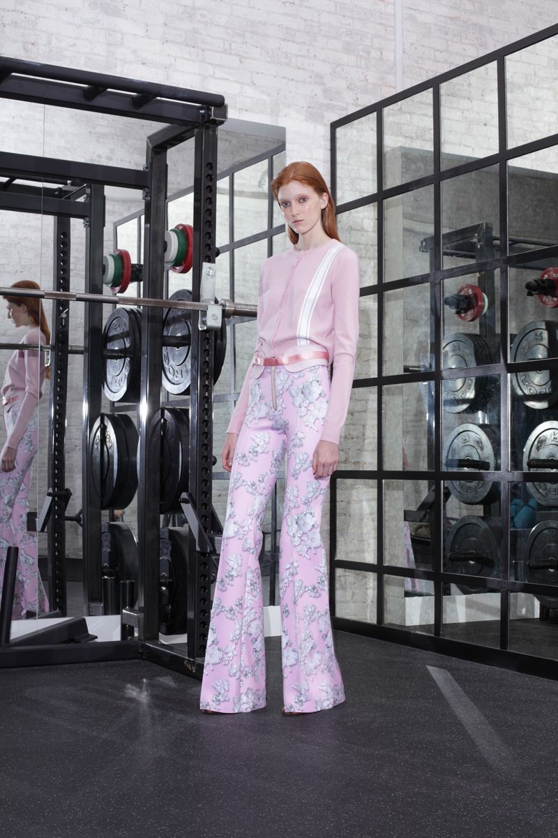 It isn’t all about fitness though. Beautifully presented were evening pieces with plunging V-neckline dresses adorned in a hint of feathers and some with embroidery, fun floral tops with white feather trim and matching leggings and a sheath in colors that are soothing; white, pink and grey imprinted with a pink floral design directly in the center. The pencil skirt and crop top are hot trends that Cynthia Rowley easily incorporated into this Resort Collection. Buy the look in black or white. The fiery red lace skirt yelled empowerment and blossoming beauty.